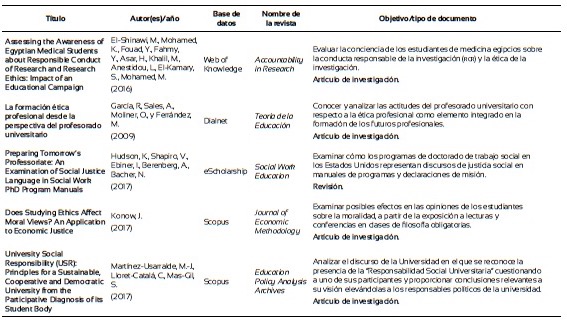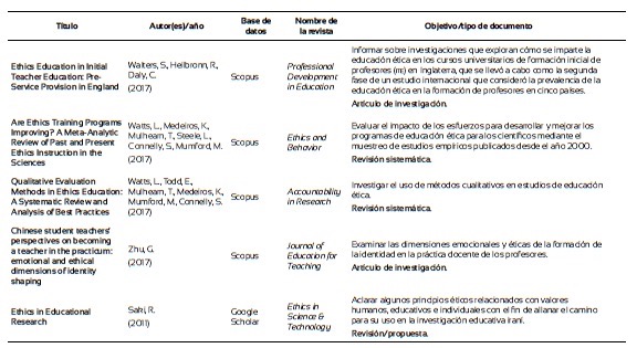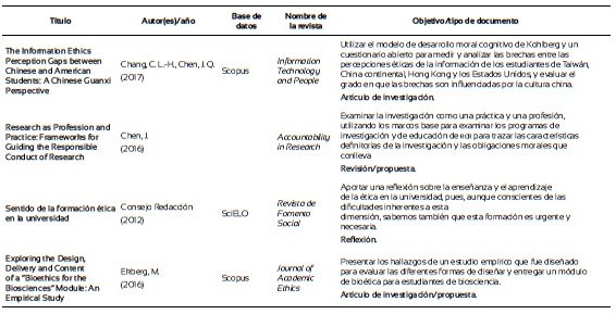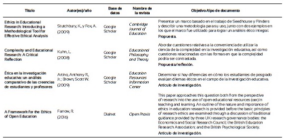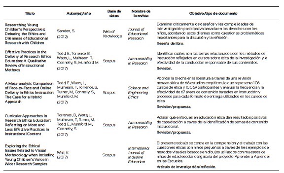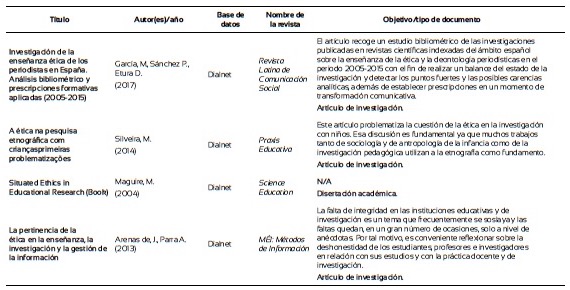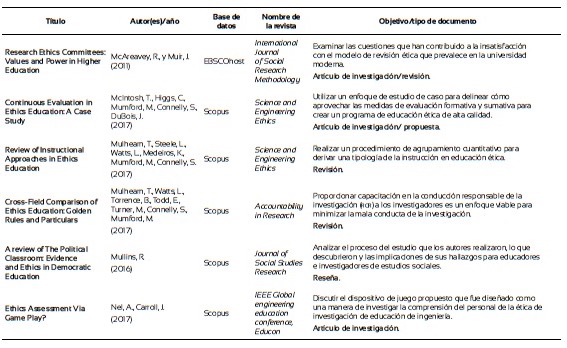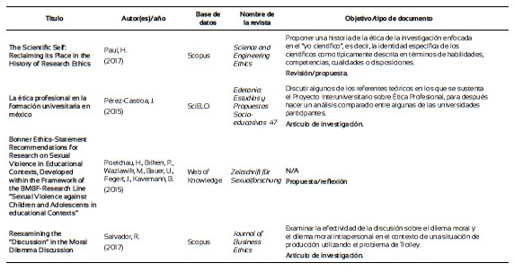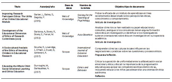 Finalmente, con el propósito de explorar el estado del arte acerca de lo que se viene investigando en relación con la formación ética de los investigadores de la pedagogía, se llevó a cabo una revisión sistemática en las bases de datos de Scopus, Scielo, Dialnet, eScholarship, ebscohost, Web of Knowledge y Google Scholar. Después de los filtros de rigor por las palabras clave: “ethics and research education” y “Research ethics and education”, y demás procedimientos propios para la elaboración de una revisión sistemática (Ferreira, Urrútia y Alonso, 2011), que incluyeron filtros de inclusión y exclusión se constituyó una base de 44 artículos (Anexo 1). Se observa que en su mayoría los estudios se centran en poner a prueba estrategias didácticas o módulos para la formación ética de los investigadores, centrados en modelos teóricos propuestos por diversos autores, mediante estudios experimentales y cuasiexperimentales. Otros exploran desde estrategias descriptivas, a partir del uso de cuestionarios y análisis de contenido, el tipo de contenidos o métodos de instrucción, incluyendo los códigos de ética, de los programas académicos de las universidades con los que se están formando los estudiantes e investigadores. Se investiga, además, mediante estudios correlacionales, si los profesores que forman en investigación tienen formación en el campo o cómo se correlacionan las opiniones de los estudiantes sobre casos que implican decisiones éticas o morales respecto a materiales revisados en cursos especializados. Figuran también varios estudios de revisión y reflexiones sobre el papel de la ética en la formación de los profesionales e investigadores de la educación. Se echa de menos estudios sobre el tema en las universidades de Latinoamérica como también sobre la eficacia de la formación moral en el desarrollo de las investigaciones a partir de indicadores que reflejen el compromiso del investigador con el seguimiento de los códigos y principios éticos.