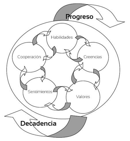 Las creencias contribuyen o no al desarrollo del bien humano, puesto que los seres humanos poseemos ciertas ideas, valoraciones y juicios que consideramos verdaderos y constituyen el piso sobre el que estamos parados, nuestro sustento vital. Los valores son obviamente constitutivos del bien humano en construcción, pero no entendidos como conceptos predefinidos y aplicables en todo contexto, sino como una noción trascendental que tiene que ver con la respuesta que buscamos cuando nos planteamos preguntas para la deliberación. A partir de estos elementos, se puede operar de manera individual y aislada o bien cooperar para ir construyendo de manera comunitaria y social el bien humano que responda a las exigencias del mundo concreto en que se vive. Según se desarrolle la cooperación auténtica o no, se va produciendo progreso -cuando se logra construir el bien humano auténtico- o bien decadencia -cuando se obstaculiza el bien o incluso se regenera el mal-.