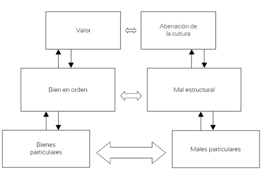 En el tercer nivel de la estructura existe además la correspondencia entre los valores y el mal como distorsión o aberración de la cultura, o sea, el mal como ceguera colectiva que evade la pregunta crítica por el bien verdadero y se niega a valorar lo realmente valioso. Se trata de un nivel de desviación que se va gestando y ahondando por generaciones hasta llegar el momento en que se confunde el bien con el mal y se empieza incluso a valorar como bueno lo que realmente es destructivo para la existencia individual y colectiva: