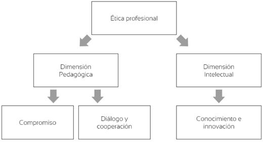 El análisis de la primera pregunta del cuestionario permitió organizar las categorías del estudio en compromiso, diálogo, cooperación, conocimiento e innovación; valores que se agrupan en dos dimensiones, de acuerdo con la propuesta de López-Zavala y Solís (2001) (figura 1).