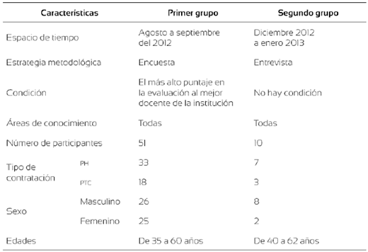 La selección de los profesores que participaron en el estudio se realizó mediante dos técnicas de muestreo, pues se consideró pertinente designar un grupo diferente de sujetos para cada estrategia metodológica. Por esta razón, los profesores que contestaron los cuestionarios fueron seleccionados a través de un muestreo intencional (McMillan y Schumacher, 2001), pues solo se consideraron a los docentes que habían obtenido los puntajes más altos en la evaluación que realizan los estudiantes de dicha institución para elegir a los mejores profesores. En contraste, los sujetos que respondieron las entrevistas fueron seleccionados mediante un muestreo aleatorio simple (Cohen, Manion y Morrison, 2003), pues se eligieron al azar entre el universo de profesores que trabajaban en el nivel superior. Todos ellos pertenecen a las diez áreas de conocimiento que existen en la UdeC: Administración y Negocios; Ciencias de la Salud; Educación; Tecnologías de la Información y la Comunicación; Agronomía y Veterinaria; Ciencias Naturales, Matemáticas y Estadística; Ingeniería, Manufactura y Construcción; Artes y Humanidades; Ciencias Sociales y Derecho, y Servicios.