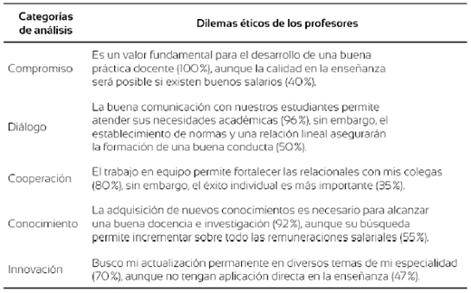 El análisis de estos valores contribuyó a identificar tres dilemas éticos. Primero, la preparación profesional de buena parte de los entrevistados se concentra en temas de su disciplina y, en contraste, se deja de lado la docencia, pues su práctica no se toma en cuenta en las evaluaciones que se realizan a nivel nacional e institucional. Segundo, el proceso de actualización profesional se dificulta cuando se espera que la universidad facilite los medios -económicos y materiales- para acceder a cursos y programas de capacitación. Tercero, se aprecia una contradicción con respecto a para qué desearían mantenerse actualizados, pues algunos no buscan precisamente el desarrollo profesional, sino la obtención de bienes externos, es decir, mejorar sus retribuciones salariales o lograr ascensos laborales. Finalmente, algunos profesores presentan necesidades de carácter actitudinal e intelectual para alcanzar una postura autónoma que les permita dirigir su propio proceso formativo, por ejemplo, realizar actividades en otras universidades y promover congresos y seminarios, así como grupos de investigación que fortalezcan su área de conocimiento.