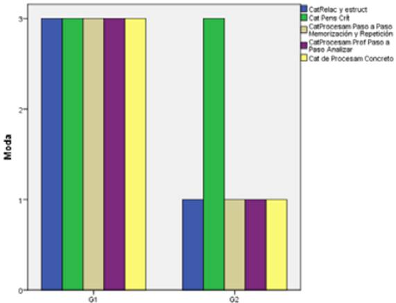 Con respecto a estrategias de procesamiento del dominio I (figura 2), encontramos que la mayoría de los estudiantes del grupo G1 puntúa alto en relacionar y estructurar, en memorización y repetición, en análisis, procesamiento concreto y pensamiento crítico. Sobre esta última dimensión el G2 también muestra fortaleza: la mayoría de los estudiantes se reconocen con dicha habilidad como elevada. No obstante, en el resto de las dimensiones del dominio I, este grupo puntúa bajo, de modo que parece el más auténticamente MD.