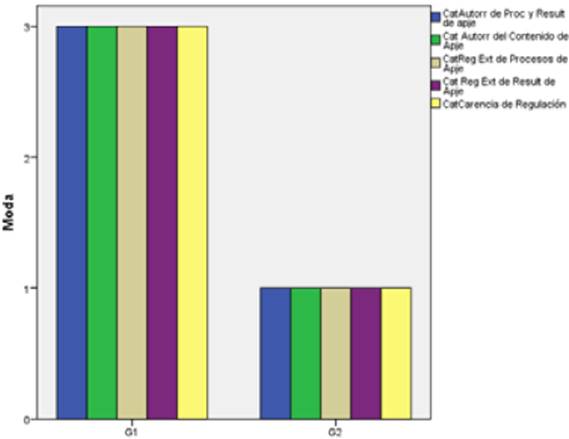 Con relación al dominio denominado estrategias de regulación (figura 3), encontramos nuevamente que el G1 muestra la activación de todo tipo de estrategias de regulación (internas y externas) en torno a los procesos de autorregulación, tanto de procesos y resultados como de contenido de aprendizaje. Asimismo, el grupo muestra una tendencia a requerir de apoyos externos para la regulación de los procesos y resultados de aprendizaje junto a la apreciación de una elevada carencia en regulación, por cuanto la mayoría de los estudiantes obtiene puntuaciones altas. Por el contrario, el G2 muestra debilidades en cada dimensión del dominio II, apreciadas en puntuaciones bajas en la mayoría de los alumnos que lo integran.