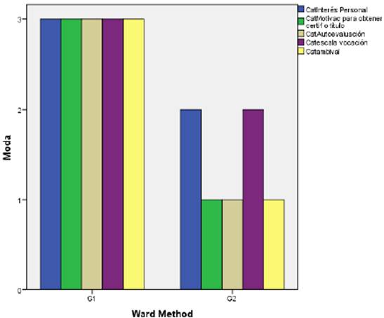 Como se aprecia en la figura 1, se identifica la conformación de dos clústers a la distancia 12. En el primero, se concentra el 55 % de la muestra (G1) y en el segundo el 45 % (G2). Las agrupaciones muestran particularidades que describen a los integrantes en función de las variables estudiadas, sobre todo en lo referido a los patrones de aprendizaje descritos por Vermunt, que analizaremos a continuación.