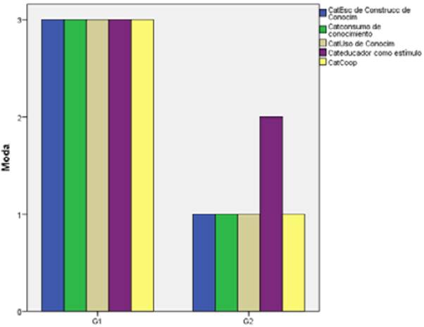 Por último, en el dominio IV, modelos mentales de aprendizaje (figura 5), encontramos que el G1 presenta puntuaciones altas en todas las categorías, mientras que en el G2 la mayoría vuelve a presentar puntuaciones bajas en cada dimensión de los modelos mentales de aprendizaje, a excepción de la escala Concebir al educador como estímulo (UD), donde obtienen puntuaciones medias.