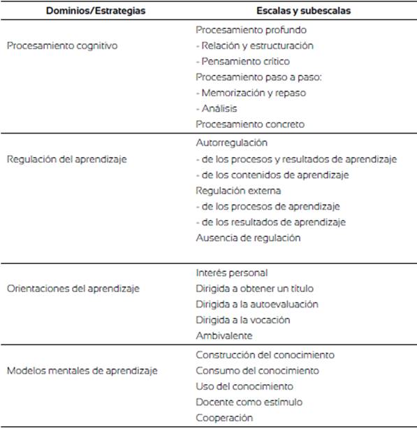 El ILS consiste en 120 afirmaciones acerca de actividades, estrategias y motivos para estudiar que se distribuyen en cuatro dominios. Vermunt (1998, 2005) postula que la combinación entre los cuatro dominios definirá cada patrón de aprendizaje: 1) concepciones de aprendizaje, que tienen que ver con el desarrollo de un sistema coherente de creencias acerca de cómo se concibe el conocimiento; 2) estrategias de procesamiento, que aluden a diferentes actividades de estudio para procesar los contenidos de aprendizaje, por ejemplo, relacionar conceptos, seleccionar información, utilizar ejemplos y aplicarlos en la práctica; 3) estrategias de regulación, vinculadas con las actividades de aprendizaje, que implican cierta dinámica de toma de conciencia y control, o no, por parte de la persona que aprende; y 4) orientaciones de aprendizaje, centradas en un dominio completo de metas, intenciones, actitudes, preocupaciones y dudas de los alumnos en relación con sus estudios.