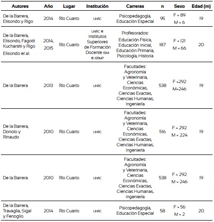 Estos artículos toman como muestra estudiantes del nivel superior de Argentina. Mientras que el primer trabajo contempla una muestra de carreras afines al campo de la educación de la Universidad Nacional de Río Cuarto (UNRC), Provincia de Córdoba, los dos estudios restantes toman estudiantes de diversos profesorados de las ciencias sociales, no solo de dicha casa de estudios, sino además de dos institutos de formación docente de la ciudad de Río Cuarto: el Instituto Superior María Inmaculada (ISMI) y el Instituto Superior Ramón Menéndez Pidal (ISRMP). En todos los casos se trabajó con un muestreo por conveniencia (Casal y Mateu, 2003).