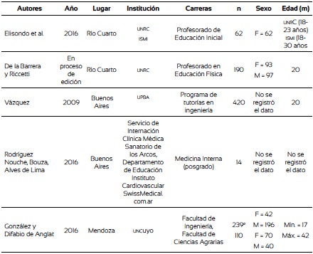 En el primer estudio, el grupo estuvo conformado por 149 alumnos de primer año (119 hombres y 30 mujeres, de edad entre 17 y 40 años) y 89 alumnos (77 hombres y 12 mujeres, de entre 20 y 35 años) de quinto año de la Facultad de Ingeniería (Universidad Nacional de Cuyo, Mendoza, Argentina). El estudio longitudinal estuvo conformado por 110 alumnos (40 varones y 70 mujeres, con una edad entre 17 y 42 años) de primer año de la Facultad de Ciencias Agrarias (Universidad Nacional de Cuyo). La muestra fue intencional para ambos estudios (tabla 1).