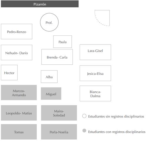 Un aspecto saliente de los cambios de lugar era que ocurrían en un solo sentido: como peones en un tablero del ajedrez, los jóvenes eran llevados desde la porción posterior del aula hacia la anterior, pero nunca en sentido contrario. Lo que parecía indicar que -como en el epígrafe que tomamos prestado a Paul Willis- los malos comportamientos también aquí ocurrían en las filas traseras. La figura 1 muestra un mapa del aula en el que puede apreciarse la disposición espacial de los jóvenes y su relación con los registros disciplinarios hacia la mitad del ciclo lectivo.