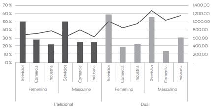La investigación muestra una alta participación de la mujer en los dos programas educativos; ellas laboran esencialmente en el sector de servicios y comercio, y sus salarios son un 10 % y 18 % menores con respecto al de los hombres. Los datos confirman lo mencionado por Chávez et al. (2017) sobre la falta de igualdad salarial entre ambos géneros y la discriminación que la mujer sufre en el mercado laboral. Es decir, ni siquiera el programa dual, que da cobijo a gente de clase media y alta, ha podido evitar este desequilibrio. Estamos entonces ante aspectos que aún deben trabajarse en el país.