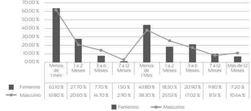 En la figura 3 se observa el género y el tiempo en que los egresados consiguieron empleo luego de graduarse, es decir, la inserción laboral. Se nota que el 63,10 % y el 61,80 % de los egresados mujeres y hombres de la dual, respectivamente, consiguen empleo antes de un mes, frente a un 43,80 % y un 38,30 % de mujeres y hombres, respectivamente, de la tradicional. También, un 2 % de egresadas mujeres y 3 % de egresados hombres de la dual consiguen empleo en un tiempo entre 7 o más de 12 meses, mientras que en ese mismo tiempo en la tradicional lo consiguen un 7,20 % de mujeres y un 10,64 % de hombres. Esto quiere decir, naturalmente, que los egresados de la tradicional tardan un mayor tiempo en la inserción laboral.