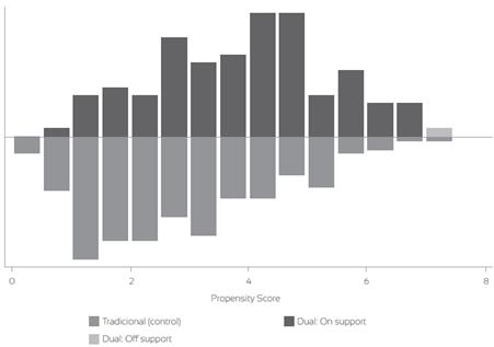 Con este primer análisis descriptivo y comparativo entre los grupos de tratamiento (dual) y de control (tradicional), el estudio se enfoca en evidenciar si dichas diferencias se mantienen. Para ello, la estimación de las puntuaciones de propensión para cada variable de tratamiento se realizó mediante un modelo probit, que aparece en el apéndice 1. Se efectuó un análisis previo de las correlaciones entre las variables explicativas y la variable dicotómica de impacto para garantizar que el programa dual no esté correlacionado con otras variables, controlando así otras características que pueden llevar a sesgos en su impacto. El resultado conforma el factor de inflación de la varianza (VIF, por su sigla en inglés) de 1,81.