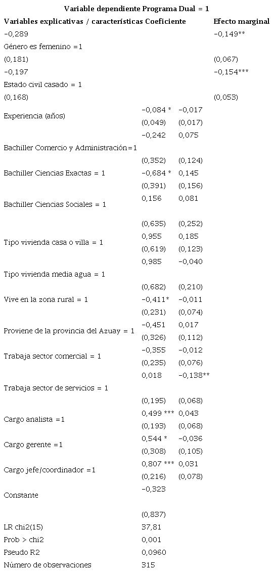 Adicionalmente, se observa en los efectos marginales que las variables género, estado civil y sector donde laboran los egresados resultan ser estadísticamente significativos a un nivel del 5 %, 1 % y 5 %, respectivamente. Se encontró que una estudiante, al ser mujer y estar casada, reduce su probabilidad en 15 puntos porcentuales de pertenecer al programa dual; de igual forma, trabajar en el sector de servicios también disminuye su probabilidad en 14 puntos porcentuales de estar en el programa.