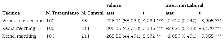 En el apéndice 2 se aprecia el efecto promedio de recibir el programa dual sobre los salarios o el tiempo de inserción en el mercado laboral de los egresados. De esta manera en la tabla 2 se considera un ATET positivo y significativo al 1 % en los tres métodos, considerando un efecto promedio significativo sobre los salarios de los egresados que recibieron el programa dual. Además, se observa una mayor robustez en la técnica radio matching, que muestra que los egresados que recibieron el programa dual mejoran sus salarios en promedio USD 305,15 más con respecto a los que no recibieron el programa, esto representa un 44 % más con respecto al salario promedio de los egresados de la tradicional. De la misma manera, con la técnica de vecino más cercano y kernel matching se evidencia que constituye un 32 % y un 38 % más con respecto al salario promedio de un egresado de la tradicional, estamos ante una variación pequeña en relación con la primera técnica.