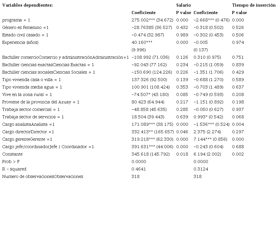 El apéndice 3 evalúa también el impacto estimado mediante el enfoque de puntuación de regresión, que computó primero individualmente el impacto para cada egresado inscrito en el programa dual y luego el promedio de esos impactos individuales, controlando de esta manera las diferencias en las características observables entre los dos grupos. Por tanto, en la tabla 3 se muestra el efecto medio significativo de tratamiento (programa dual) estimado sobre los salarios y el tiempo que tardan en insertarse al mercado laboral sus egresados, siendo USD 275,00 y en 2 meses 20 días, respectivamente.