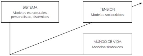 Desde la perspectiva habermasiana, Sabirón (2007) establece una comparación con los condicionantes que tienen en nuestra vida las reglas del sistema al que pertenecemos (figura 1). Encontramos dos ejes que enmarcan la construcción del conocimiento científico-social: el sistema y el mundo de vida. El primero está constituido por las reglas del sistema al que pertenecemos. El segundo, también denominado comunicativo, se refiere a la persona, a su fuerza individual, la reconoce como parte de colectivos, organizaciones, instituciones y sistemas. Si pensamos en la relación entre esos dos planos, podemos imaginar "la tensión entre ambas fuerzas capaces de contextualizar el sentido y significado que podemos conferir a nuestras distintas acciones" (Sabirón, 2007, p. 37). La tríada 210 se completa con la tensión, contradicciones y conflictos entre los dos primeros ejes, desde cuyas perspectivas se consideran las lógicas de razonamiento científico-social. Como explica el mismo autor, nos hallamos frente a "modos de razonamiento instrumental desde la perspectiva del sistema, comunicativa para el mundo de vida, e ideológica en la tensión a la que cada individuo, grupo, organización e institución responden" (p. 38). Así, tres esquemas dominantes rigen la razón: eficientista en la lógica instrumental; interpretativo o hermenéutico en la comunicativa; y dialéctico y crítico en la ideológica.