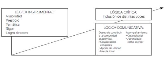 El análisis de los ejes semánticos en los que se agrupan las razones expresadas por los participantes mostró que no hay fronteras completamente delimitadas entre ellas. A la luz del modelo de las lógicas del razonamiento científico-social (Sabirón, 2007), algunas razones pueden ubicarse en uno de los tres planos de razón; otras hacen explícito el nexo con motivos puntuales inmersos en otra lógica o con el sentido global que emana de otro plano. Este es el caso de respuestas referidas a la temática, la inclusión de diversas voces, la voluntad de aportar a la comunidad académica y el logro de retos (figura 2).