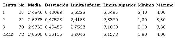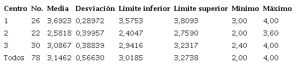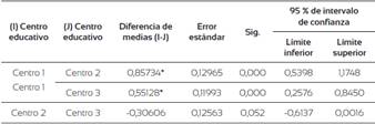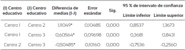De dicha tabla se desprende que existen diferencias estadísticamente significativas entre los centros 1 y 2, y los centros 1 y 3; por tanto, los resultados del centro 1 son superiores a los del resto.