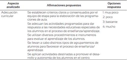 Para el estudio del tercer objetivo se plantearon las afirmaciones que se detallan en la tabla 12, relacionadas con adecuación curricular, respuesta metodológica y criterios de adaptación en el aula e individual.