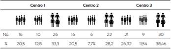 Dentro de las características de la muestra (tabla 1), se destaca una proporción de docentes por centros similar, entre 26-30 docentes por colegio, siendo levemente superior en el centro 3, mientras que la proporción entre hombres y mujeres es desigual, con superioridad de participación en las segundas.