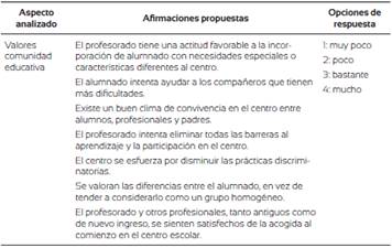 A la hora de explorar los valores inclusivos en la comunidad educativa se utilizaron los ítems que aparecen en la tabla 4, los cuales guardan relación con aspectos como convivencia, respeto y concienciación con la diversidad.