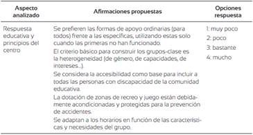 Dicha herramienta de autoevaluación consiste en un cuestionario basado en cuatro ámbitos en los que se analizan el contexto escolar, recursos, resultados y proceso educativo. Con su planteamiento se formulan afirmaciones propias del enfoque inclusivo que los docentes, de modo individual, deben responder, y así, mostrar su nivel de coincidencia con la expresión propuesta mediante la escala Likert de 1 a 4 (1: muy poco; 2: poco; 3: bastante; 4: mucho).