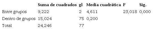 Del mismo modo que se hizo con los anteriores objetivos, para comprobar la importancia de estas diferencias se aplicó la prueba ANÜVA, acompañada de la prueba la prueba post hoc Bonferroni para comparar entre grupos (tablas 14 y 15).