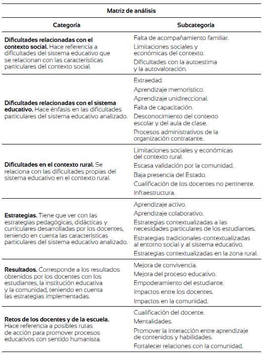 Para este análisis, se hizo una triangulación de los datos, técnica que permite la articulación de toda la información obtenida en la investigación para obtener una comprensión más clara del problema estudiado (Taylor y Bogdan, 1987). De esta manera, se tabularon los datos relacionados con las características de la población participante para luego caracterizarlos. Posteriormente, se leyó la información obtenida en las entrevistas a los docentes. A partir de ahí, se codificaron los datos; en particular, se reunieron y analizaron aquellos que se refieren a un tema, concepto e idea común (Taylor y Bogdan 1987; Álvarez-Gayou 2003; Fernández, 2006). Este procedimiento dio origen a una matriz de análisis compuesta por seis categorías: dificultades relacionadas con el contexto social; dificultades relacionadas con el sistema educativo; dificultades en el contexto rural; estrategias; resultados, y retos del docente y de la institución educativa. Esto se complementó con varias subcategorías por cada una, con el fin de identificar los hallazgos principales. Por último, para presentar los resultados, los datos se analizaron a la luz de la información cualitativa obtenida en las entrevistas a los docentes.