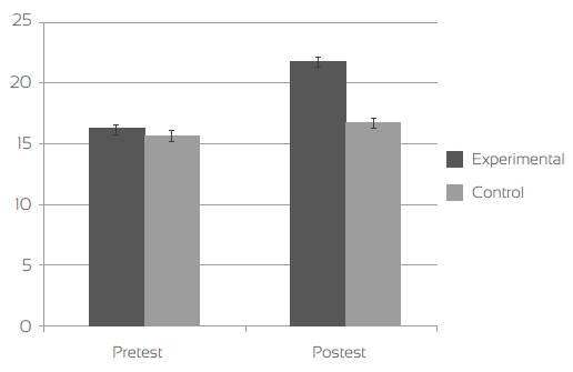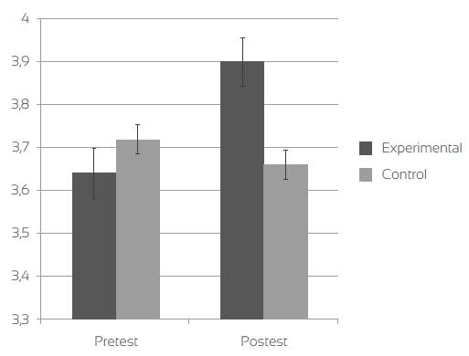 Los puntajes en la prueba de actitudes fueron analizados con un modelo linear mixto, en el cual las medidas repetidas, pretest/postest, se incluían como el factor intrasujeto y los grupos de la intervención como el factor entre-sujetos. Este análisis mostró que el efecto de la interacción entre el grupo y el cambio pretest/postest tenía un efecto significativo, F(1, 46)=4,97, p=0,031). Este cambio no tuvo un efecto significativo. En la figura 1, se puede observar cómo los puntajes del grupo control disminuyen mínimamente entre el pretest y el postest, mientras que los puntajes del experimental aumentan tras la intervención.
