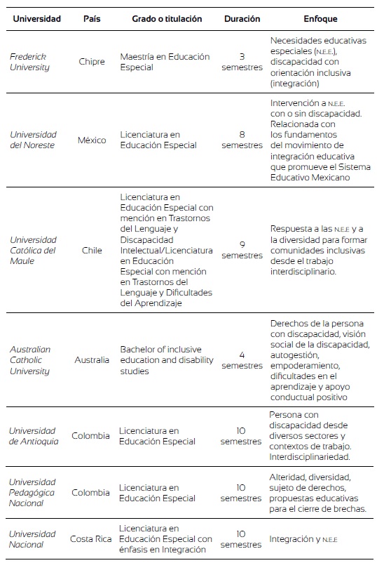 En relación con lo que se ha tratado hasta ahora es interesante acercarse a ofertas de formación docente en Educación Especial que se han transformado en los últimos años, con la intención de conocer la forma en que vienen interpretando y asumiendo cambios relacionados con la educación inclusiva en distintos países y según se hace posible detectar mediante la información colgada en los sitios web de las diversas universidades estudiadas.