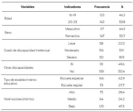 La muestra fue de conveniencia y estuvo compuesta por 264 jóvenes con discapacidad intelectual cuyas edades oscilaban entre los 16 y 23 años (ᾱ = 18.73; D.T.= 10.08). La mayor parte de los encuestados cursaban sus estudios en centros de educación especial ubicados en la Región de Valparaíso y en la Región de Coquimbo (Chile). Más de la mitad de los participantes tenían discapacidad intelectual moderada (n= 156) y eran mujeres (n= 147). En la tabla 1 se explicitan algunas de las características sociodemográficas de los encuestados.