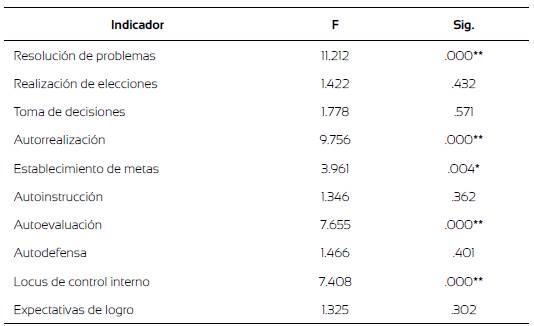 Al focalizar el análisis en las puntuaciones generales asociadas a los diferentes indicadores que conforman el constructo de autodeterminación, los puntajes de algunos de estos indicadores difieren según el grado de discapacidad de los participantes (tabla 10). En concreto, existen diferencias significativas a la hora de desarrollar habilidades para la autorrealización (p= .000), la autoevaluación (p= .000), la resolución de problemas (p= .000), el establecimiento de metas personales (p= .004) y el locus de control interno (p= .000). En estos indicadores los promedios para el grupo de personas con discapacidad leve son superiores que para los participantes con discapacidad moderada o severa.