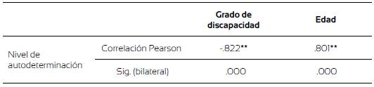 En otro orden de ideas, teniendo en cuenta las diferencias en las puntuaciones generales sobre los niveles de autodeterminación de los participantes en atención a la edad y el grado de discapacidad, se ha considerado oportuno estudiar la relación entre estas variables (tabla 10). El análisis de correlación que aplica Pearson evidencia una relación alta e inversa entre el nivel de autodeterminación y el grado de discapacidad (r= -.822). Sin embargo, la correlación es alta pero positiva entre los niveles de autodeterminación de los estudiantes y su edad (r= .801). El estadístico Chi-cuadrado permite determinar la asociación entre estas variables. Según las cifras resultantes, el grado de discapacidad (x2= 35 332; p= .000) y la edad (x2=34 789; p= .000) inciden de forma significativa en los niveles de autodeterminación de los estudiantes. En el caso de la edad, el nivel de autodeterminación se incrementa conforme los participantes van creciendo. No obstante, cuanto más acusado es el grado de discapacidad, menos habilidades relacionadas con la autodeterminación se evidencian entre los estudiantes.