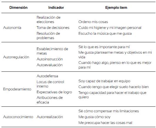 Se compone de cuatro secciones estructuradas en cuatro dimensiones: autonomía (25 ítems), autorregulación (12 ítems), empoderamiento (14 ítems) y autoconocimiento (10 ítems). Estas dimensiones se desglosan en una serie de ítems (en total 61) que miden los diferentes indicadores sobre autodeterminación que sugiere el Modelo Funcional de Autodeterminación (Wehmeyer, 1995; 2014) (Tabla 2). La escala debe ser cumplimentada por la propia persona con discapacidad. No obstante, existe la posibilidad de aplicarla en forma de entrevista si la persona requiere alguna necesidad de apoyo específica. En la subescala de autonomía se responde atendiendo a una escala tipo Likert 1-3 desde "no lo hago nunca, aunque tenga la oportunidad" hasta "lo hago siempre que tengo la oportunidad". En el resto de las subescalas, el encuestado debe mostrar su grado de acuerdo ante diferentes afirmaciones en una Escala Likert 1-4 (desde "no estoy nada de acuerdo" hasta "estoy totalmente de acuerdo"). Aunque la escala se aplica en formato de autoinforme, es preciso que el proceso de evaluación esté supervisado por un profesional de apoyo para poder garantizar que los encuestados comprenden la totalidad de los ítems.