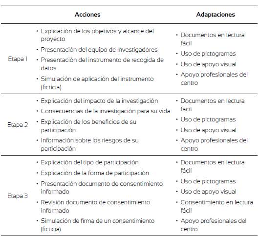 Fruto de ese análisis, los investigadores decidieron acoger los lineamientos establecidos en la Declaración de Montreal sobre Discapacidad Intelectual (OPS, 2004) y en la Convención Internacional sobre los Derechos de las Personas con Discapacidad (ONU, 2006). Ambos documentos abogan por el derecho de las personas con discapacidad intelectual a tomar decisiones propias, contando para ello con los apoyos contextuales oportunos. A partir de esta premisa, y al asumir este enfoque de derechos, los investigadores prescindieron del uso de pruebas neuropsicológicas para evaluar la capacidad de toma de decisiones de la muestra, y se decantaron por adaptar el proceso de consentimiento informado a las características, necesidades y requerimientos de los participantes. Este proceso se estructuró en tres etapas: presentación de los objetivos de la investigación a los participantes, impacto de la investigación en su vida e implicaciones derivadas de su participación en la investigación. Estas tres etapas se concretaron mediante talleres informativos en cada uno de los centros con los que se estableció contacto. Las fases que conformaron el proceso de consentimiento informado se configuraron como un apoyo a la toma de decisiones, por parte de los estudiantes, sobre su potencial participación en el proyecto. En la tabla 3 se presenta un desglose de las acciones y las adaptaciones asociadas a cada una de las fases de este proceso.