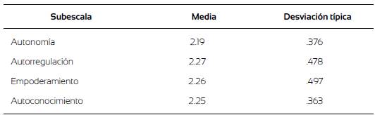 El análisis de los estadísticos descriptivos para cada una de las subes-calas del instrumento (tabla 5) evidencia cómo los participantes presentan el promedio más elevado en la subescala de autorregulación (ᾱ = 2.27), mientras que el desarrollo de habilidades relacionadas con la autonomía (ᾱ = 2.19) está más descendido.