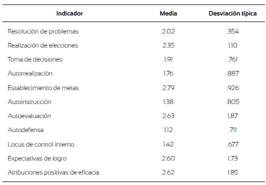 Si se focaliza la atención en los indicadores sobre autodeterminación relacionados con las distintas dimensiones del constructo (tabla 6), se observa cómo el desarrollo de habilidades de autoevaluación (ᾱ = 2.63), el desempeño de conductas asociadas a atribuciones positivas de eficacia (ᾱ = 2.62) y a expectativas de logro (ᾱ = 2.62) presentan los promedios más elevados. Sin embargo, la ejecución de comportamientos relacionados con la autodefensa (ᾱ = 1.12), el locus de control interno (ᾱ = 1.42) o la autorrealización (ᾱ = 1.76) apenas tienen presencia entre las conductas de los participantes.
