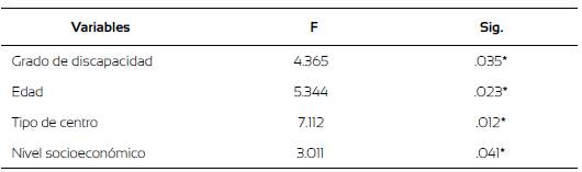 Para profundizar en el análisis se ha estudiado la existencia de diferencias significativas atendiendo a algunas variables sociodemográficas como la edad, el género, el grado de discapacidad intelectual, la presencia de discapacidades asociadas, el tipo centro educativo al que los encuestados acuden o en el que participan y su nivel socioeconómico. Para determinar la significatividad de las diferencias entre puntajes se ha comprobado la normal distribución de los datos utilizando la prueba de Kolmogorov-Smirnov como paso previo al cálculo del estadístico Anova (F). Al comparar las puntuaciones generales con las diferentes variables sociodemográficas (tabla 7) encontramos diferencias significativas en función del grado de discapacidad (p= .035), la edad (p= .023), el tipo de establecimiento educativo (p= .012) y el nivel socioeconómico de los participantes (p= .041).