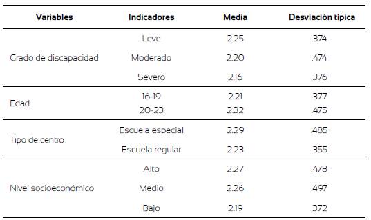 El análisis de los promedios para cada una de las variables sociodemográficas estudiadas según la puntuación total de la escala (tabla 8) evidencia cómo las personas con discapacidad intelectual leve (ᾱ= 2.25) presentan un promedio significativamente más elevado que los participantes con discapacidad moderada (ᾱ= 2.20) y severa (ᾱ= 2.16) en cuanto al desarrollo de comportamientos autodeterminados. Del mismo modo, los participantes con edades comprendidas entre los 20-23 años (ᾱ= 2.32) desarrollan de forma más significativa competencias de autodeterminación que los estudiantes de entre 16-19 años (ᾱ= 2.21). Con respecto al tipo de establecimiento educativo, quienes acuden a una escuela de educación especial (ᾱ= 2.29) tienen significativamente mayores niveles de autodeterminación que aquellos participantes que cursan sus estudios en escuelas regulares que cuentan con programas de integración escolar (pie) (ᾱ= 2.23). Por otra parte, los participantes con un nivel socioeconómico alto (ᾱ= 2.27) presentan promedios significativamente más elevados en su autodeterminación que las personas con discapacidad intelectual con niveles socioeconómicos medios (ᾱ= 2.26) o bajos (ᾱ= 2.19).