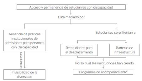 A partir del análisis de la información emergen cinco categorías, las cuales se muestran en la figura 1. Las condiciones de acceso y permanencia de estudiantes con discapacidad están mediadas por la ausencia de política institucional de admisiones para las personas con discapacidad, lo que genera una invisibilidad de la diversidad. Por su parte, y en relación con la permanencia, las personas se enfrentan a retos diarios para el desplazamiento hacia la universidad y a barreras de infraestructura al interior de las instituciones, por lo cual las universidades han creado algunos programas de acompañamiento para sus estudiantes.