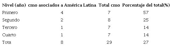 En la tabla 1 se identifica que, de una totalidad de 29 CMO en los programas ministeriales, solo hay ocho que aluden directa o indirectamente al concepto de América Latina. En cuanto a porcentajes, desde primero hasta cuarto año de enseñanza secundaria, la presencia de los CMO sobre América Latina es de un 27 % con relación al total de contenidos incluidos en los documentos ministeriales. No obstante, esto no quiere decir que un 27 % de los CMO se dediquen a América Latina de manera profunda y exhaustiva, sino que el concepto aparece al menos nombrado, referido o señalado.