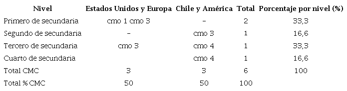 Desde la LC, se hace necesario cuantificar algunos aspectos sobre la presencia de América Latina como contenido en los programas antes mencionados. Así, se seleccionaron aquellos CMO que presentaban entre sus descriptores a América/América Latina de un modo directo y explícito. Consideramos los planteamientos de Tosar (2018), siguiendo las preguntas de ¿quién está representado?; ¿qué voces faltan?; ¿quién se beneficia de esto?; ¿qué medidas podrías tomar con base en el texto? La información se presenta en la tabla 1, donde en cada nivel existen siete CMO, con excepción de segundo medio, donde se encuentran ocho.