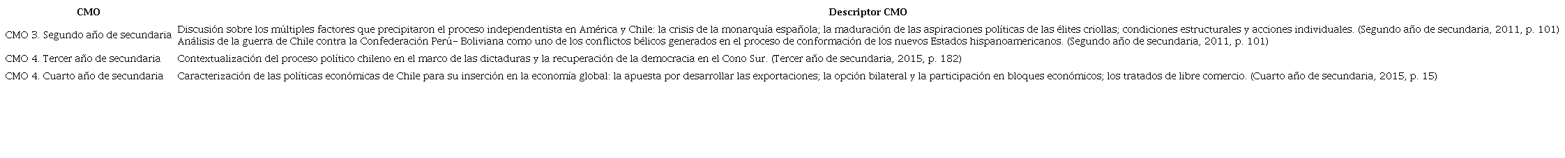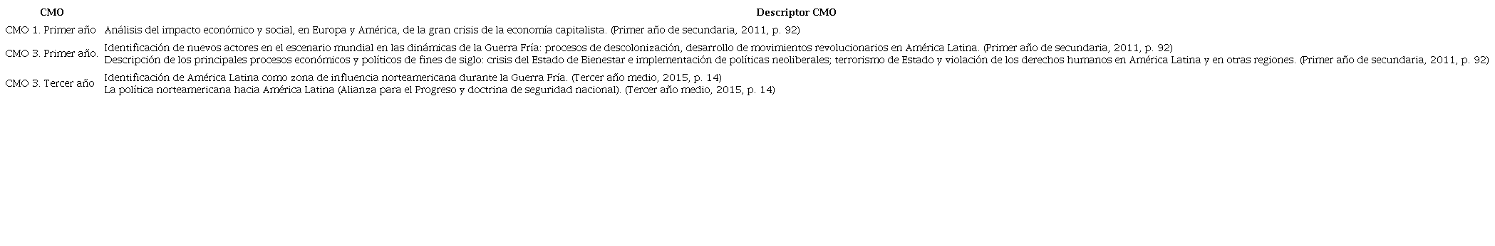 En el CMO 3 de primer año de enseñanza secundaria se afirma que el proceso histórico central es la Guerra Fría desde una perspectiva historio-gráfica. Los nuevos actores en el escenario mundial no tienen relevancia ni pertinencia para América Latina, sino que los discursos, los escenarios y los protagonistas son parte del mundo europeo, blanco, occidental y masculino (Tamayo, 1975). En tal punto, solo se remiten a relatar contenidos ligados a procesos económicos y políticos de finales del siglo, como el Estado de bienestar, las políticas neoliberales, entre otras. En especial se hace mención a las violaciones de los derechos humanos, no obstante, son trabajados desde perspectivas que no cuestionan el proceso. El currículo resalta la descripción de acontecimientos históricos que se relacionan con temas de política y economía, en general, desde la visión oficial del Gobierno (Marolla y Pagés, 2018; Ortega et ál., 2020; Pagés y Sant, 2012).