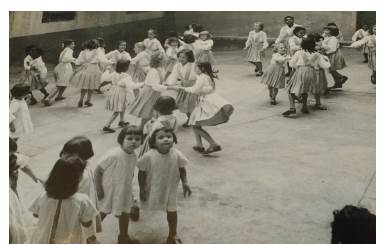 Na fotografia, as crianças maiores, todas meninas, brincam de roda. Apesar de parecer uma atividade livre, a composição da brincadeira na imagem indica certa organização e orientação com relação àquele momento, pois há quatro grupos formando quatro rodas separadas, com quatro ou cinco crianças em cada uma delas. Quem brinca de roda na fotografia são as maiores, enquanto as meninas menores parecem observar e, inclusive demonstram curiosidade ao olhar diretamente para quem está tirando a fotografia. Percebe-se que estas pequenas usam vestidos soltos, confortáveis e com abertura traseira, como aventais hospitalares, sem a preocupação em cobrir tanto seus corpos. Parece ser o conforto e a facilidade para vestir ou retirar a roupa, assim como a possiblidade de tratar delas higienicamente, que dão o tom do atendimento àqueles corpos infantis. Já as maiores, ostentam uniformes de modelo escolar, inclusive com camisas de mangas cumpridas e saias com pregas.