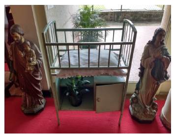 Do ponto de vista expositivo, a fotografia do berço encontrado na atualidade da creche possibilita ao expectador visualizar o cenário que foi cuidadosamente preparado para sua exposição. O berço no centro, ladeado por duas grandes imagens católicas: de São José com o menino Jesus nos braços e, a Nossa Senhora da Conceição, parecem reproduzir um minipre-sépio, no qual a manjedoura foi substituida pelo berço. Neste caso, não apenas a presença católica da instituição está marcada na representação do minipresépio, como a concepção de uma infância a ser protegida, cuidada e amada se mostram presentes.