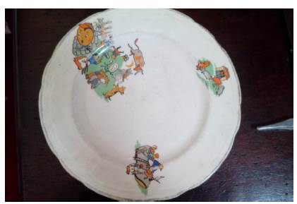 Por outro lado, outro utensílio, também de uso infantil, um prato de porcelana com desenhos que remetem às cantigas infantis européias, carrega em si uma representação de uma infância que, para além dos cuidados básicos, brinca, canta e possui características próprias que seriam valorizadas por uma ação educativa dentro da creche. Mais uma vez, educação e assistência emergem nos objetos que materializam práticas e representações de uma infância institucionalizada naquele ambiente.