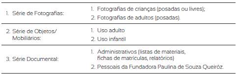 As fontes materiais encontradas na creche foram organizadas da seguinte forma: