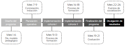 La implementación del programa de formación2 tuvo diferentes momentos clave. En la Figura 1 se presenta la línea de tiempo de las fases del programa, usando los meses de ejecución del proyecto como referente.