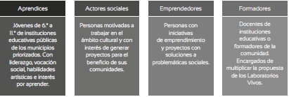 El programa educativo estuvo enmarcado en la formación no formal y tuvo como conceptos transversales la cultura, la tecnología y la innovación social en dos cohortes3 con participantes de cuatro perfiles (véase Figura 2).